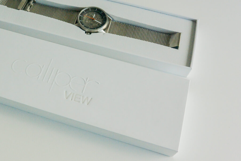 We’ve got a prototype for our packaging. We’re keeping it very simple and clean. It will be a white box with embossed text. The word ‘caliper’ will be embossed outward (convex) and the word ‘VIEW’ will be concave.