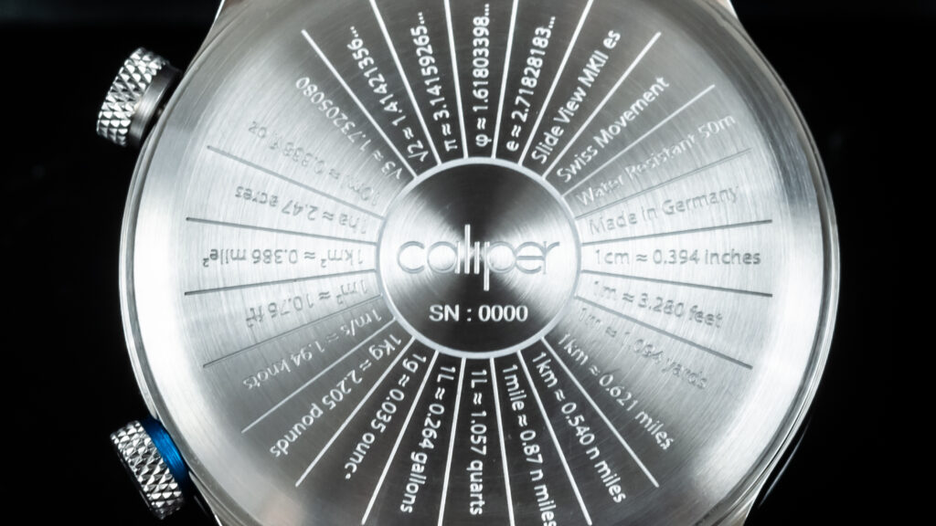 In this version, we have used a quartz movement with a battery that will last several years (The original caliper Slide View was mechanical). No winding, no setting. When you want to wear this watch, it’s ready to go.